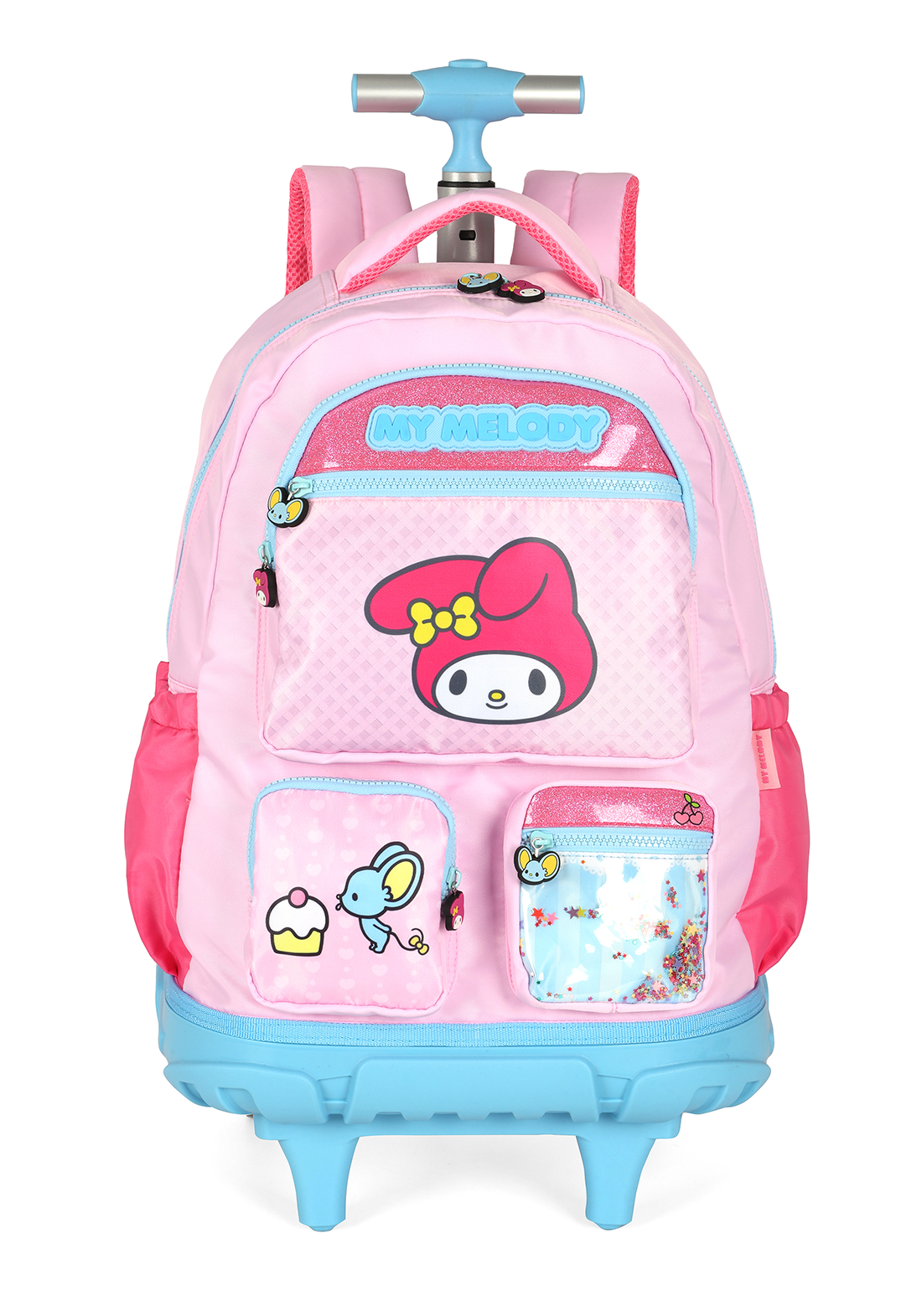 A Mochila de Rodinhas My Melody MC49694SR faz parte da coleção oficial My Melody, amiguinhos da Hello Kitty, e foi desenvolvida para unir praticidade, conforto e estilo em qualquer ocasião. Confeccionada em náilon resistente, possui dimensões de 46 x 34 x 22 cm, capacidade aproximada de 28 litros, sendo classificada como mochila média e compatível com 18 polegadas, ideal para uso escolar ou no dia a dia.