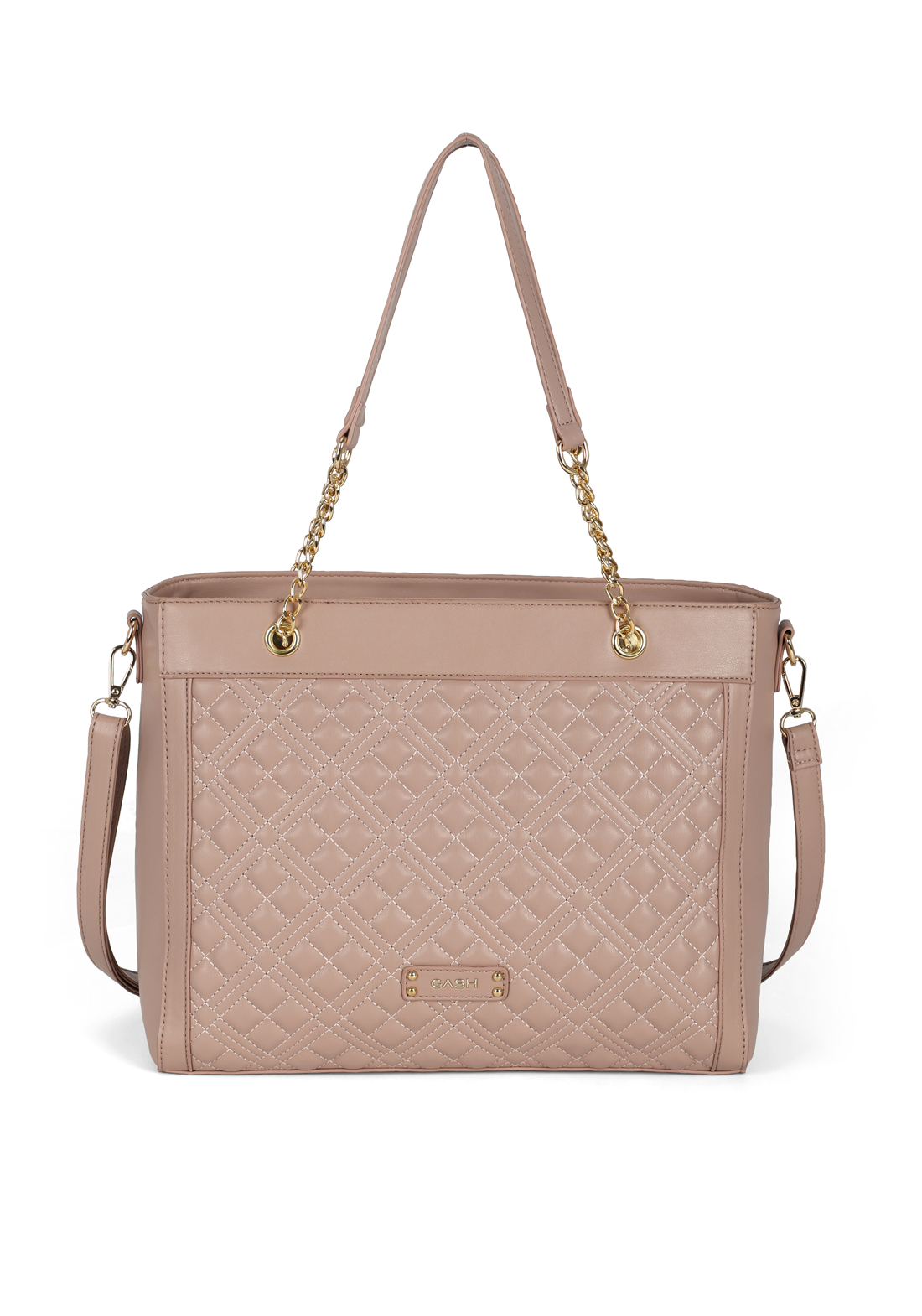 Com design matelassê em padrão quadriculado diagonal, ela traz o logo da marca aplicado em berço de PU (couro sintético), alças com detalhes em correntes e acabamento impecável. Seu interior conta com forro exclusivo e bolsos que facilitam a organização, enquanto as alças versáteis (de ombro e transversal) permitem diferentes formas de uso.