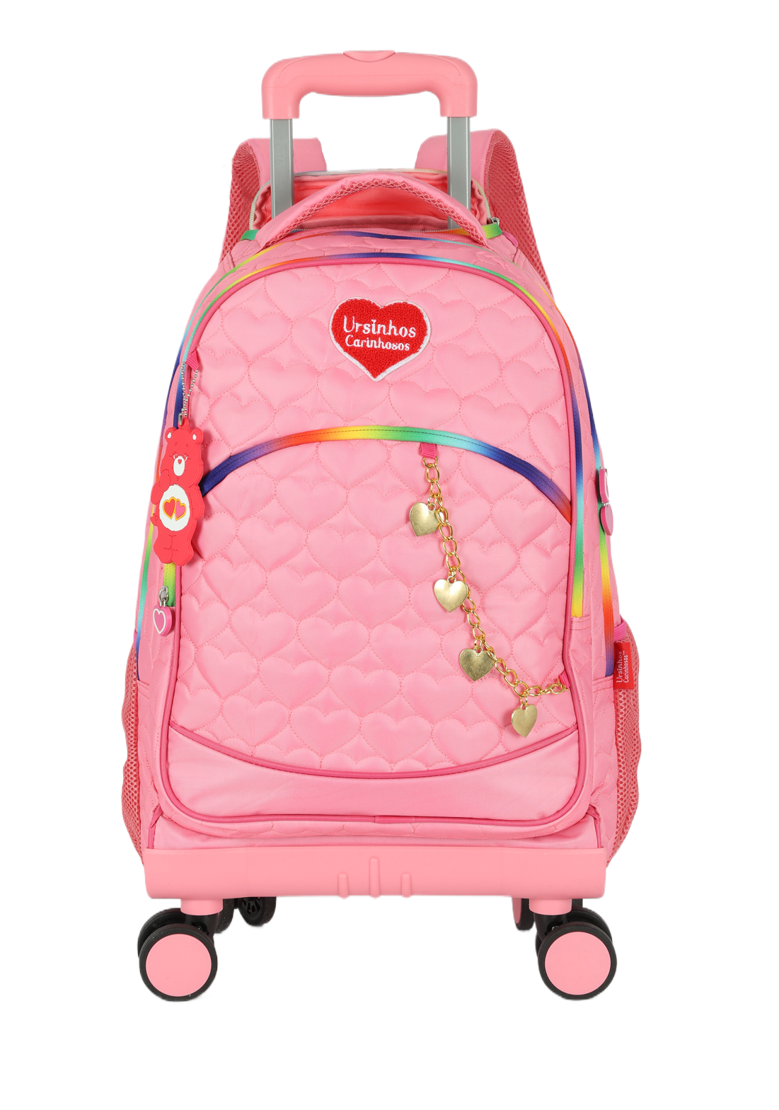 Apresentamos um dos modelos mais aguardados da coleção Ursinhos Carinhosos: a mochila com rodas de corrente em matelassê coração. Ideal para compor seu kit escolar, acompanhar você em passeios ou viagens escolares, esta peça une funcionalidade, conforto e um design encantador.
