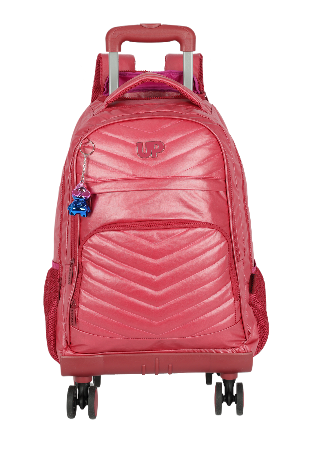 Elas estão de volta! A coleção Crinkle Metalizado Up4you retorna com ainda mais estilo e funcionalidade. Agora com rodas duplas 360° e uma base atualizada, essa mochila oferece máxima mobilidade e conforto para o dia a dia. As alças traseiras são removíveis e podem ser guardadas no bolso exclusivo, tornando a mochila extremamente versátil. Com um design moderno e detalhes cuidadosamente pensados, como o chaveiro personalizado da mascote UP e o material Crinkle metalizado, essa mochila é perfeita para quem quer combinar estilo e praticidade em qualquer lugar.