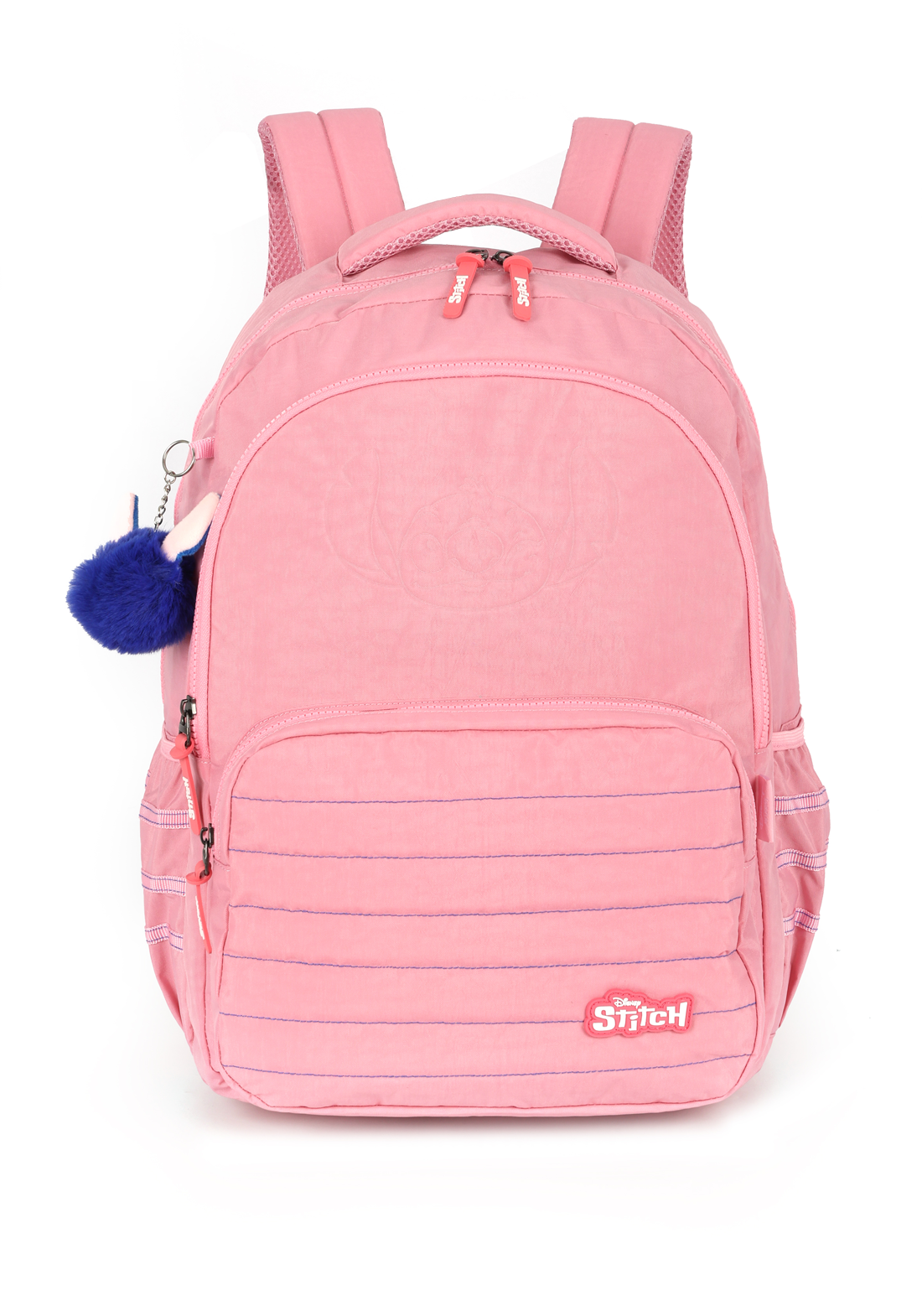 • Detalhes apaixonantes: Tecido Crinkle, logo emborrachado, bordado Stitch e chaveiro de pompom.